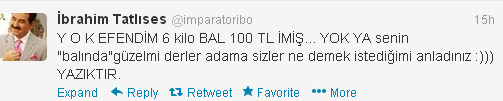'Sayın Mehdi Eker bakanım; benim halkıma yazıktır günahtır. Nedir bu balcılardan çektiği? Şeker ve glikoz karıştırıp vatandaşıma satıyorlar. Bir de 'arı sahtekarlık yapmaz' diyorlar. Ama kendileri hilenin babasını yapıyorlar. Bu ne olacak? Benim temiz ve inanana halkım? Hiç 6 kilo bal 100 TL olur mu? Biz vatandaşlar reklama kanıp yiyoruz. Ben yemediğimi yedirmem. Hakiki balın kilosu kaç para biliyor musunuz? Tabii buldunuz garibim halkı vurun abalıya... Sayın Bakanım'a güvenim tamdır. Babam der ki 'ucuz mal her zaman pahalıdır, sakın ha!' Benim şoförüm Cengiz bile o tuzağa düşmüş. Biz ne dersek diyelim epler, keseler doldu taşıyor. Hatta çuvallar bile... Bir binanın altına imalathane kurmuşlar. Bas şekeri, bas glikozu haydi yallah... Benim belli değerlerim vardır. 'Yemediğimi yedirmem, giymediğimi giydirmem' By Tatlıses... Sizler yemiyorsunuz ama allayıp pullayıp yediriyorsunuz '