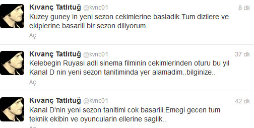 Konuya ilişkin twitter hesabı üzerinden açıklama yapan Tatlıtuğ, 'Kelebeğin Rüyasi adlı sinema filminin çekimlerinden ötürü bu yıl Kanal D'nin yeni sezon tanıtımında yer alamadım. ' dedi.