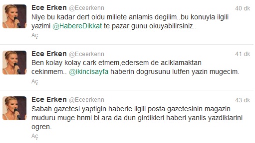 İşte Sabah Gazetesi'nin bu haberi ünlü sunucu Ece Erken'i adeta çılgına çevirdi. Yapılan haberle ilgili sosyal paylaşım sitesi Twitter'dan açıklamalarda bulunan Erken, 'Sabah gazetesi yaptığın haberle ilgili posta gazetesinin magazin müdürü Müge hnmi bir ara da dun girdikleri haberi yanlış yazdıklarını öğren' diye yazdı. Ben kolay kolay çark etmem diyerek Sabah Gazetesi'ne seslenen Ece Erken, 'Niye bu kadar dert oldu millete anlamış değilim' ifadelerini kullandı.