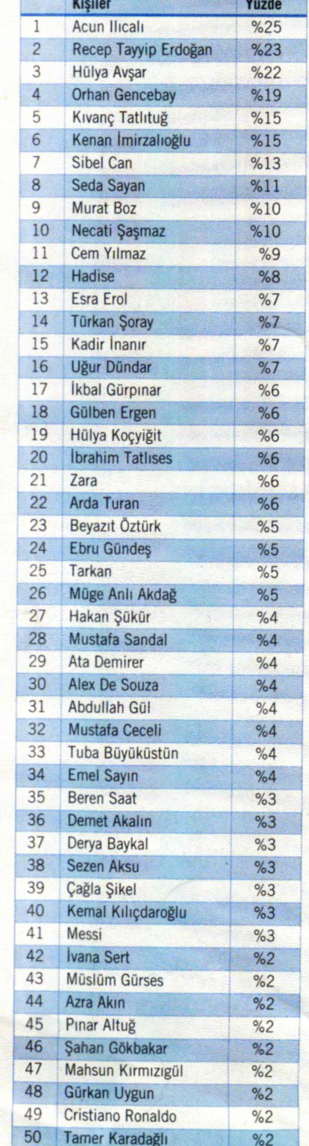 MediaCat'in işbirliği içerisinde olduğu Ipsos 15 - 60 yaş aralığına dair yaptığı rol model araştırmasında Acun Ilıcalı zirvede yer aldı. İkinci sırada yıl boyunca yaptığı açıklamalarla gündemden düşmeyen Başbakan Recep Tayyip Erdoğan bulunurken, Hülya Avşar ise genel listede üçüncü, kadın larda birinci sırada yer alarak Türkiye'nin zihninde en önemli isimler olarak kodlandılar.