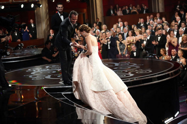 85'inci Oscar ödülleri sahiplerini buldu .Umut Işığım (Silver Linings Playbook) filmindeki performansıyla En İyi Kadın Oyuncu ödülünü alan Jennifer Lawrence sahneye çıkarken elbisesine takılıp düştü. Hemen kendisini toparlayan güzel oyuncunun düşmesi an be an kameralara yansıdı.
