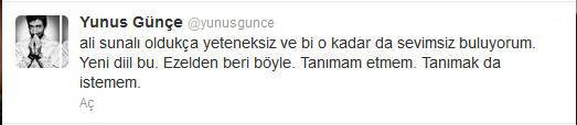 Yunus Günce, sayfasından “Ali Sunal 'ı oldukça yeteneksiz ve bir o kadar da sevimsiz buluyorum. Yeni değil bu. Ezelden beri böyle… Tanımam etmem, tanımak da istemem” sözleriyle eleştirdi.
