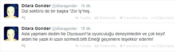 Kanal D ekranlarında yayınlanan Ne Diyosuun! dizisinin yıldızı Dilara Gönder, Twitter'dan dizinin yayından kaldırıldığını açıkladı.
