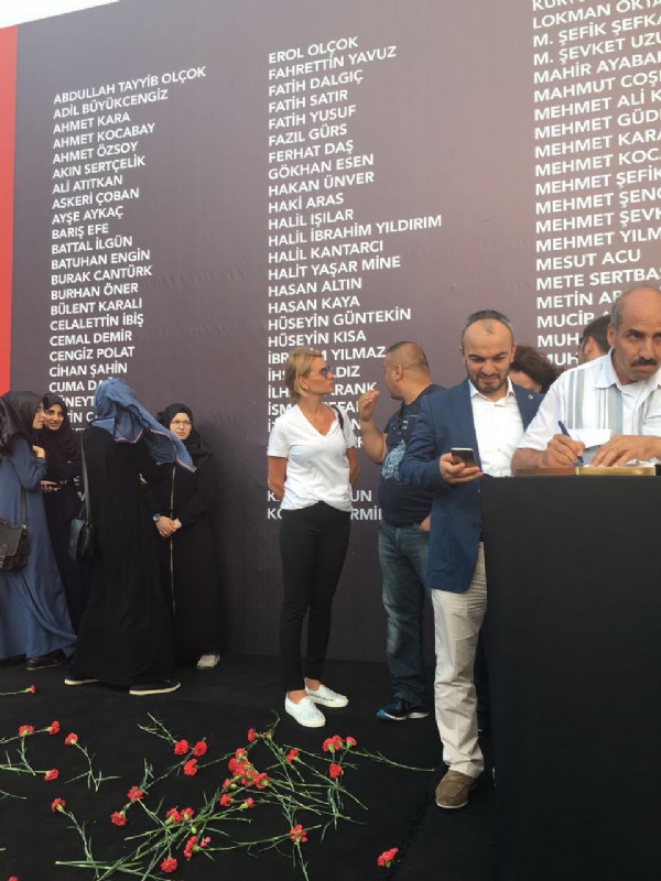 Önce Taksim'e giden Erol, darbe girişimine karşı koydukları sırada hayatını kaybeden şehitleri anarak meydanda oluşturulan alana kırmızı karanfiller bıraktı.
