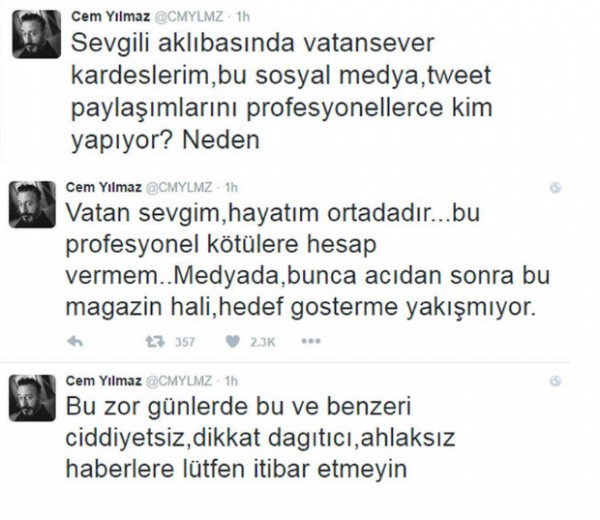15 Temmuz darbe girişimi sonrası Twitter hesabından hiç paylaşım yapmadığı icin Yurt dışına kaçtı, darbe yanlısı gibi yapılan paylaşımlar sonrası Cem Yılmaz suskunluğunu bozdu.