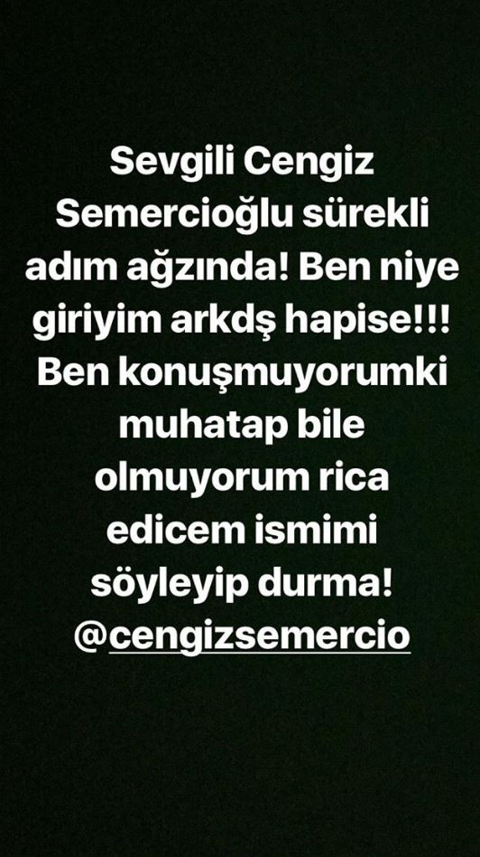 O sözlere Demet Akalın'dan karşılık geldi. Akalın, Instagram hesabından 'Sevgili Cengiz Semercioğlu, sürekli adın ağzında! Ben niye giriyim arkadaş hapise! Ben konuşmuyorum ki. Muhattap bile olmuyorum. Rica edeceğim ismimi söyleyip durma.' notunu düştü.