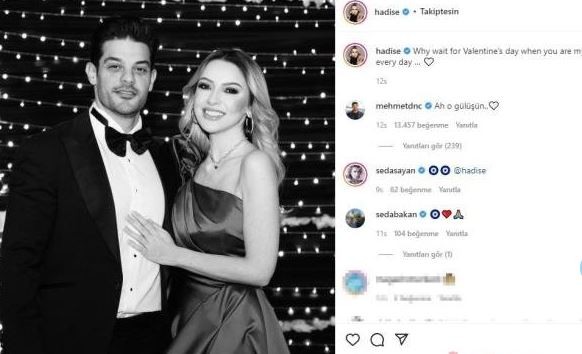 Hadise, nişanlısı Mehmet Dinçerler'le fotoğrafını paylaşarak fotoğrafın altına, 'Her gün benim sevgilim olduğun halde neden sevgililer gününü bekleyeyim' notunu ekledi.