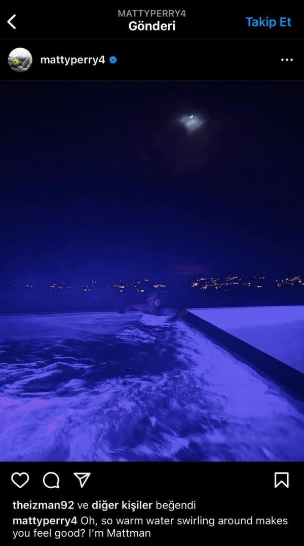 Aktörün yakın çevresi onun son zamanlarda bu alışkanlıklarından uzaklaştığı ve iyi durumda olduğunu ifade ettiler. Perry'nin Friends dizisinden ve başka projelerde birlikte çalıştığı arkadaşları büyük bir şok yaşıyor. Öte yandan yıldız oyuncunun son Instagram gönderisinde de evindeki jakuzide çekilmiş bir fotoğrafını paylaştığı ve altına "Oh, etrafta dönen ılık su seni iyi hissettiriyor mu? Ben Mattman'" yazdığı ortaya çıktı.