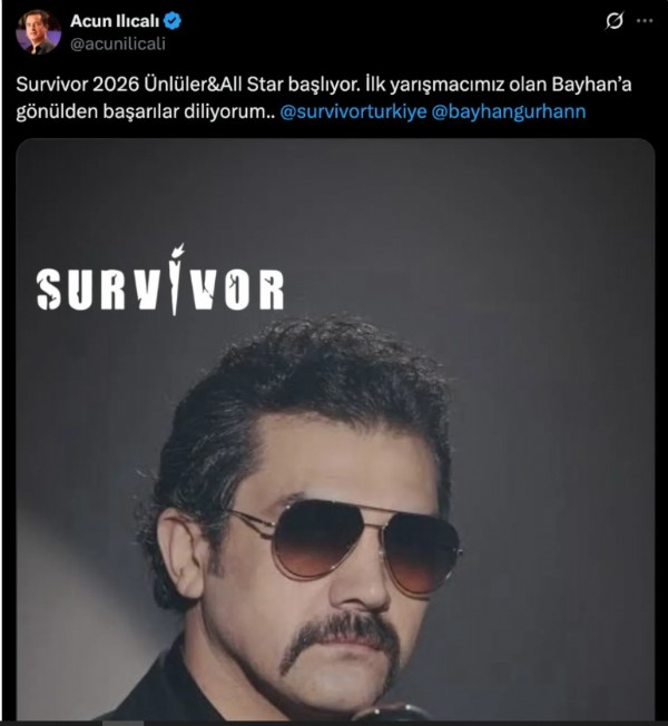 Ilıcalı, heyecanlandıran paylaşımına şu notu düştü: 'Survivor 2026 Ünlüler&All Star başlıyor. İlk yarışmacımız olan Bayhan'a gönülden başarılar diliyorum.'