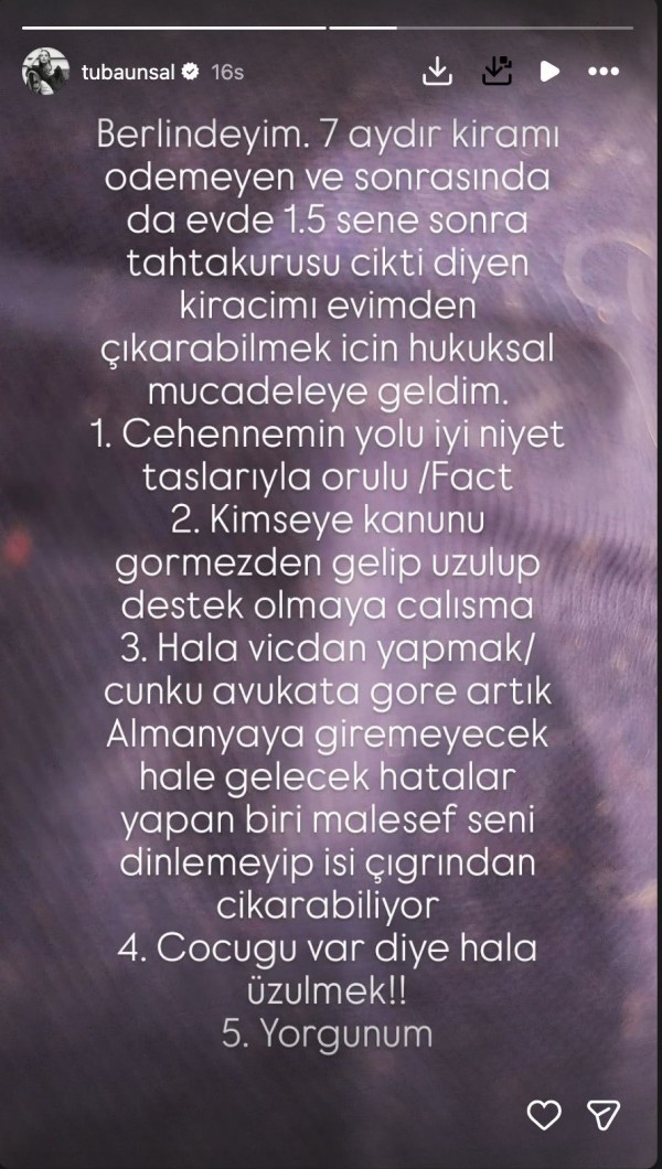 Berlin'deki kiracısıyla sorun yaşayan Tuba Ünsal, sosyal medyadan hayranlarıyla yaşananları anlattı.