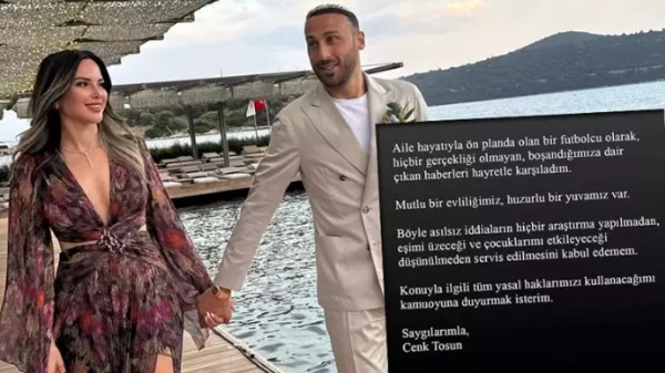 ''Aile hayatıyla ön planda olan bir futbolcu olarak, hiçbir gerçekliği olmayan, boşandığımıza dair çıkan haberleri hayretle karşıladım. Mutlu bir evliliğimiz, huzurlu bir yuvamız var. Böyle asılsız iddiaların hiçbir araştırma yapılmadan, eşimi üzeceği ve çocuklarımı etkileyeceği düşünülmeden servis edilmesini kabul edemem. Konuyla ilgili tüm yasal haklarımızı kullanacağımı kamuoyuna duyurmak isterim. Saygılarımla, Cenk Tosun''