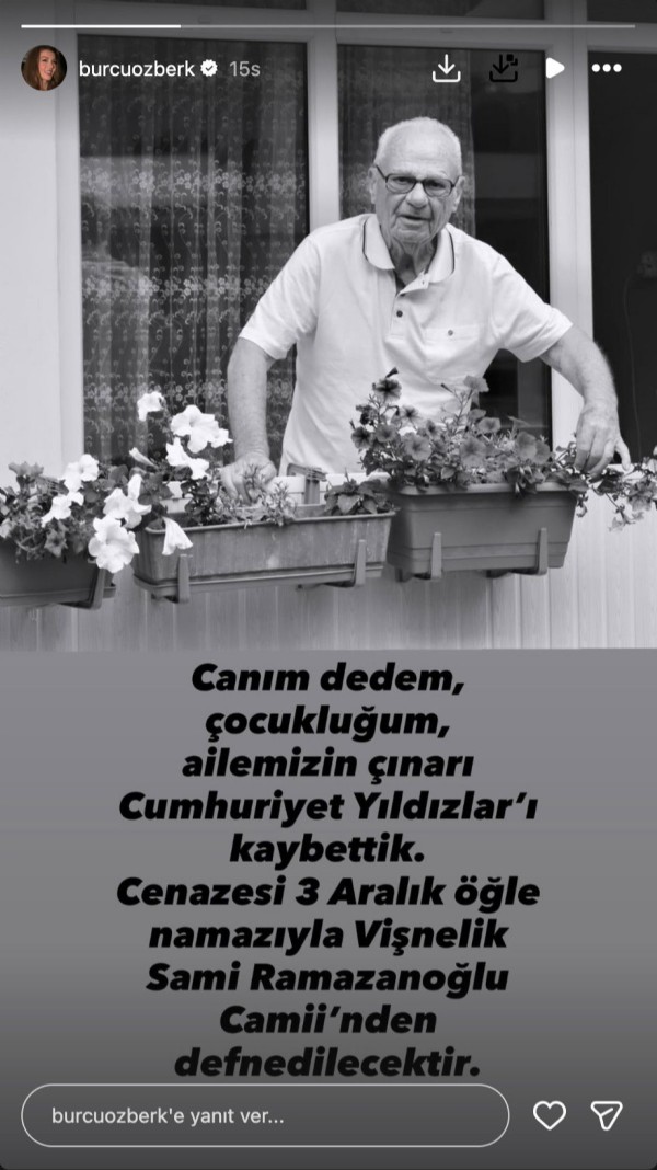 Ekranların beğenilen oyuncularından Burcu Özberk, dedesinin hayatını kaybettiğini duygusal bir paylaşımla duyurdu.